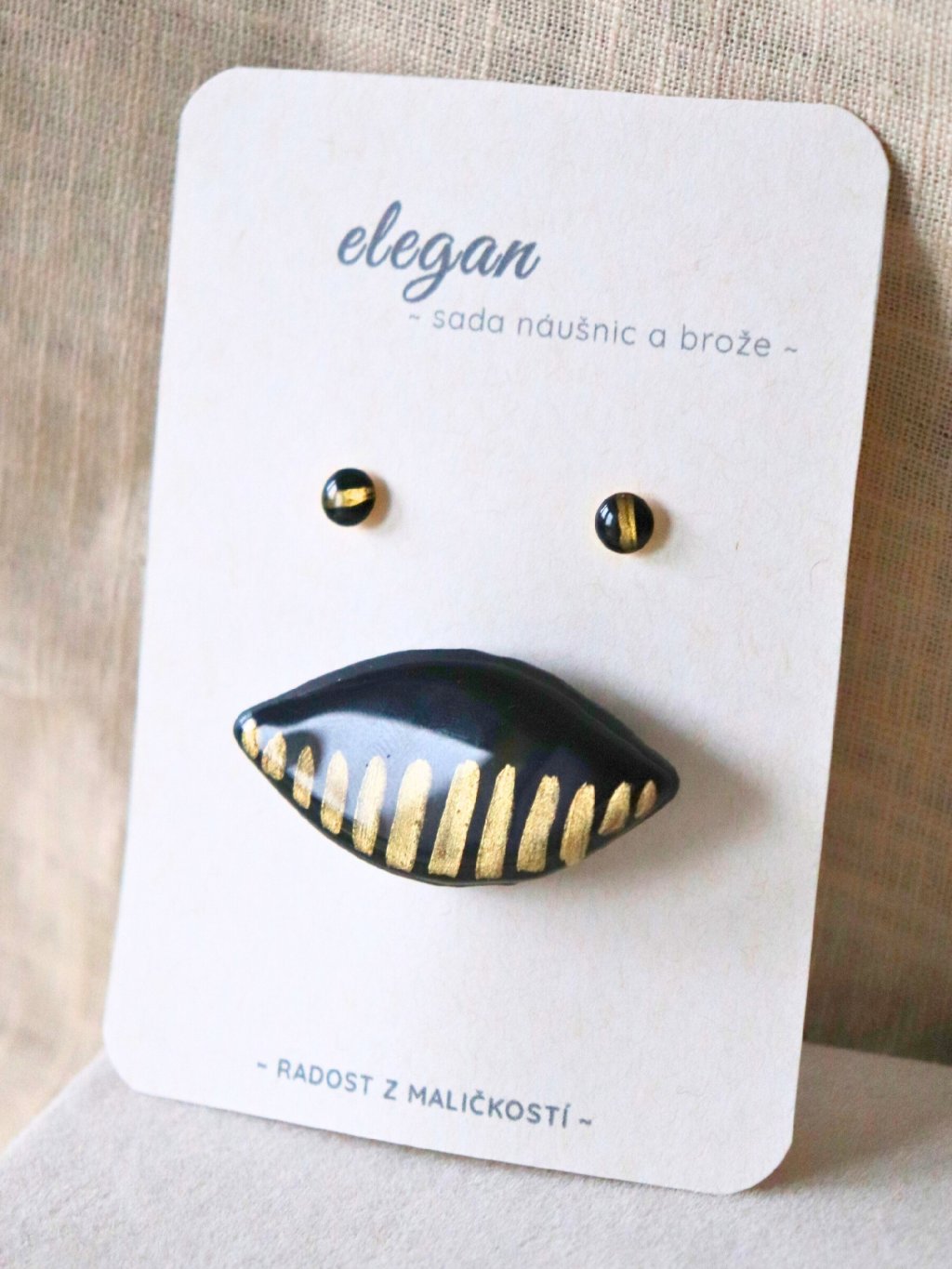 Sada brože a drobných náušnic ve zlaté a černé barvě.