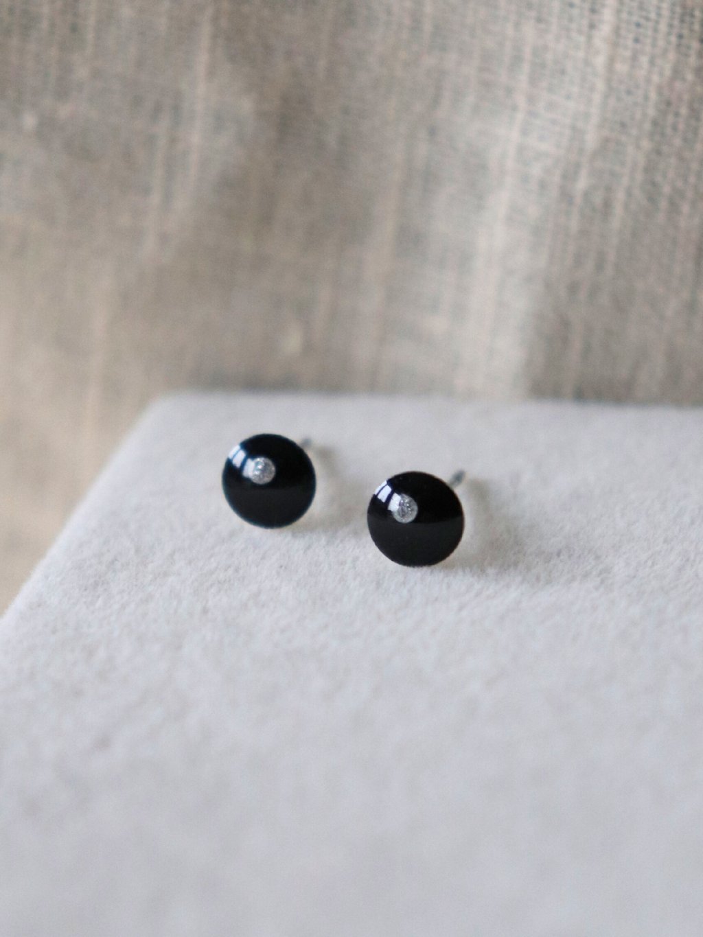 Moderní hranaté černé náušnice ve tvaru čtverce doplněné menšími kulatými černými peckami se stříbrným motivem tečky.