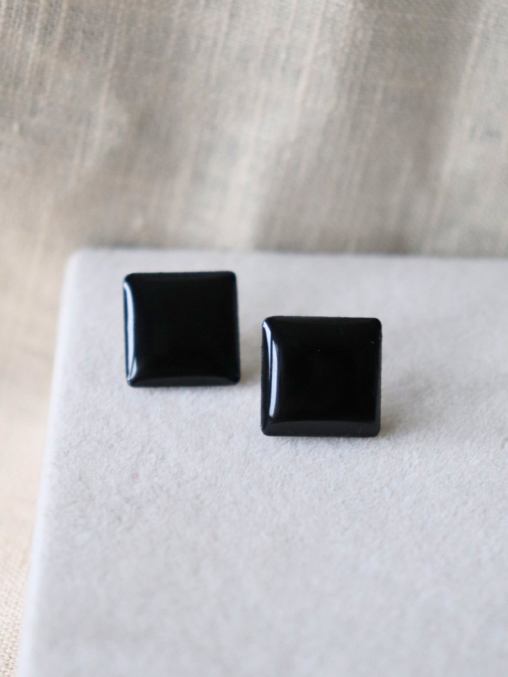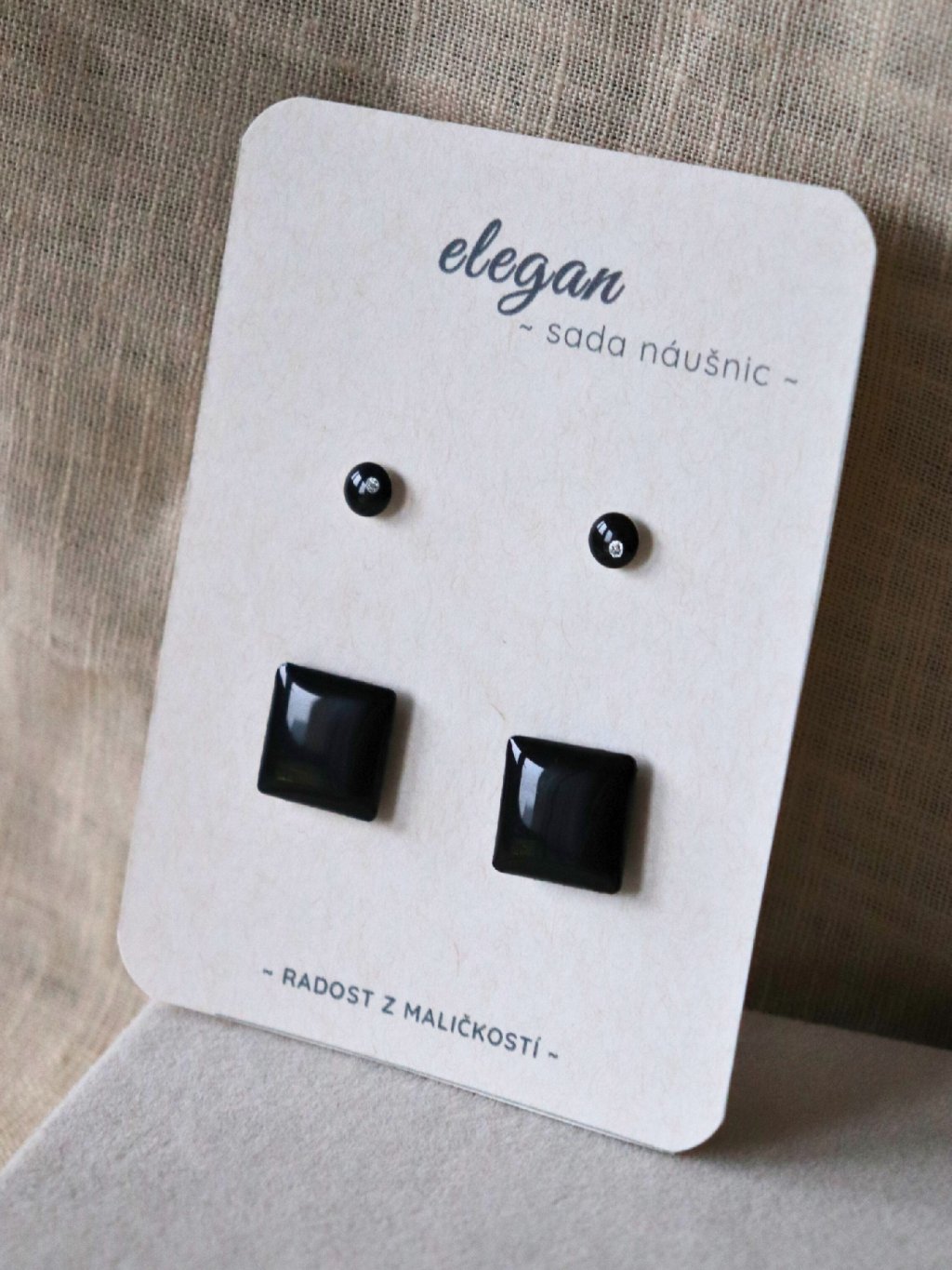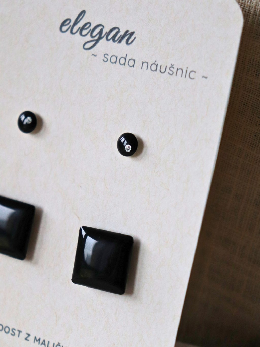 Sada napichovacích náušnic v černé barvě se stříbrným vzorem - čtverec a drobné kolečko.