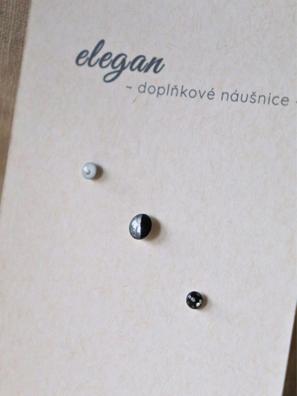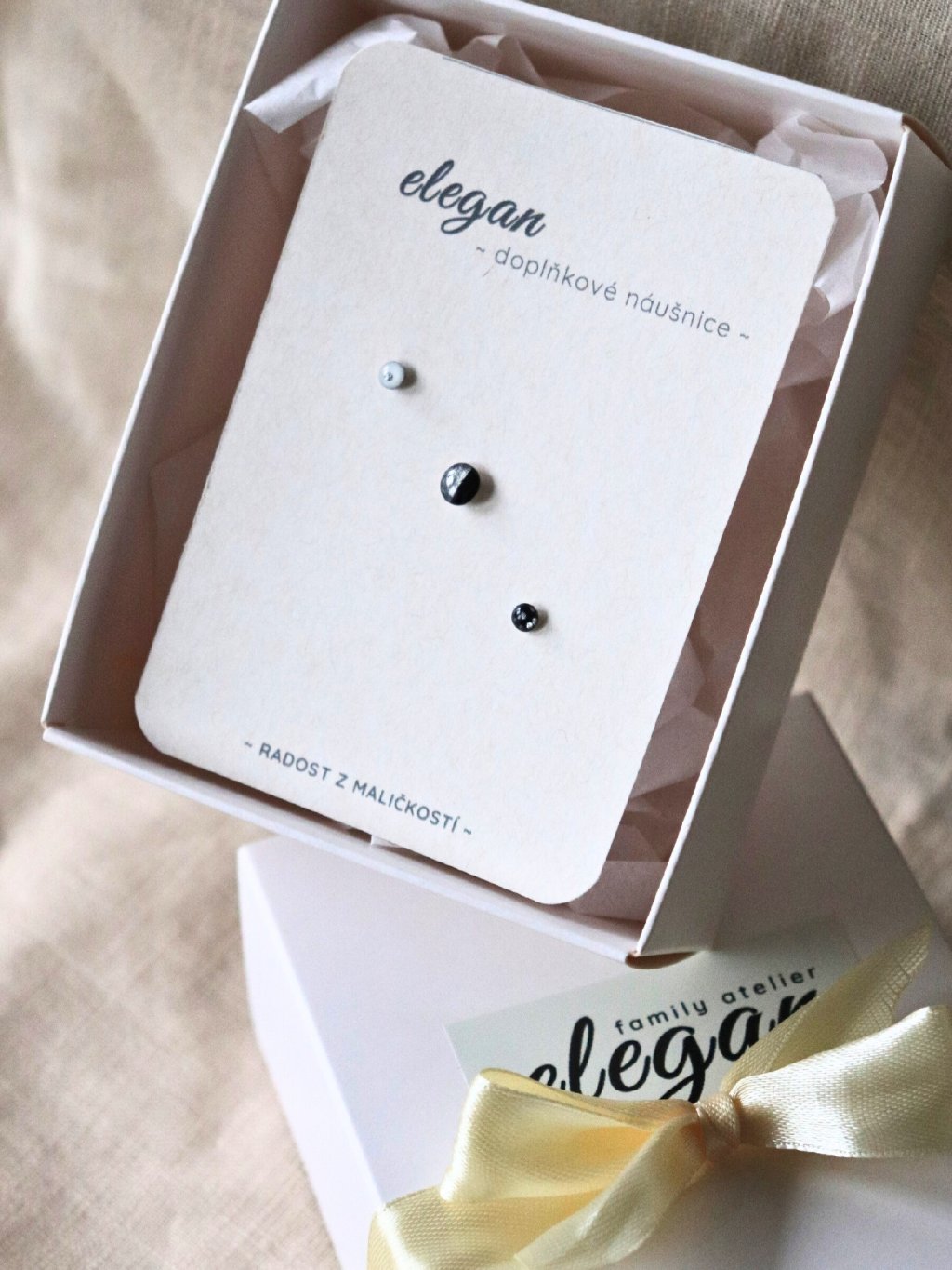 Šperky jsou nachystané na papírové kartičce, přicestují k vám ještě v dárkové krabičce Elegan se saténovou stuhou.