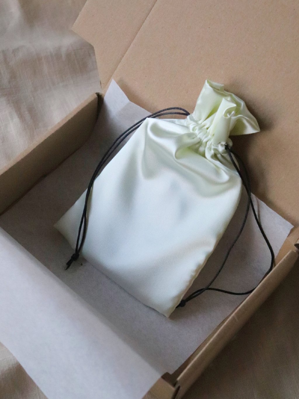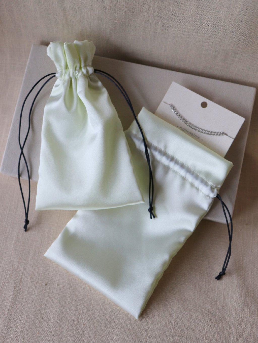 Vanilkový elegantní pytlíček na šperky ušitý ze saténu v naší dílně. Objednejte ho společně s našimi šperky a budete mít balení vyřešené.
