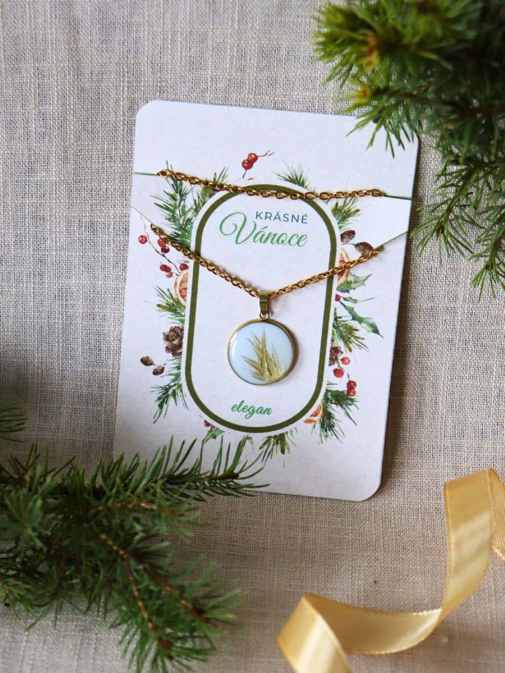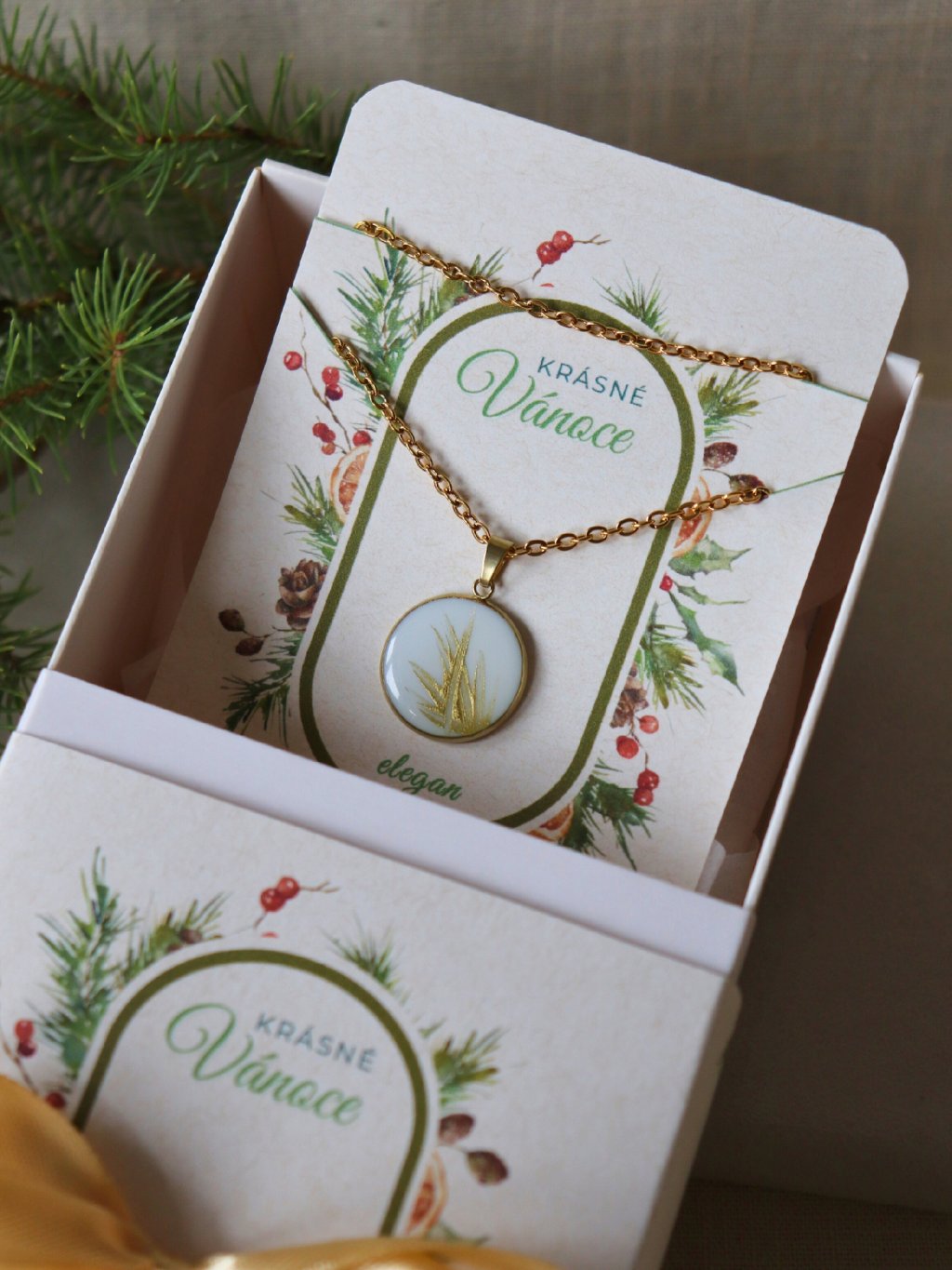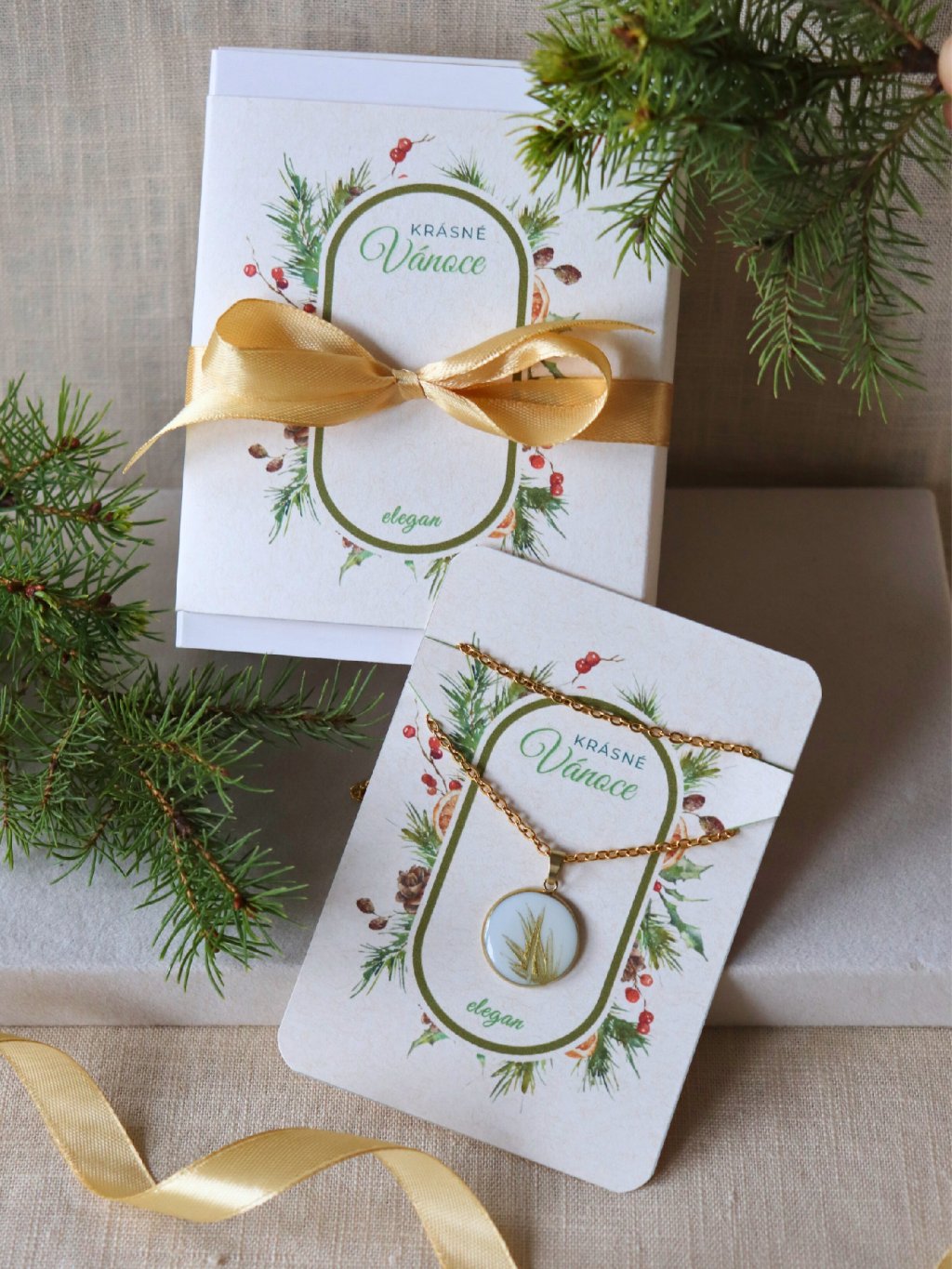 Vánoční balíček Elegan je krásně zabalený set s ručně vyráběným náhrdelníkem, připravený rovnou k předání pod stromeček.