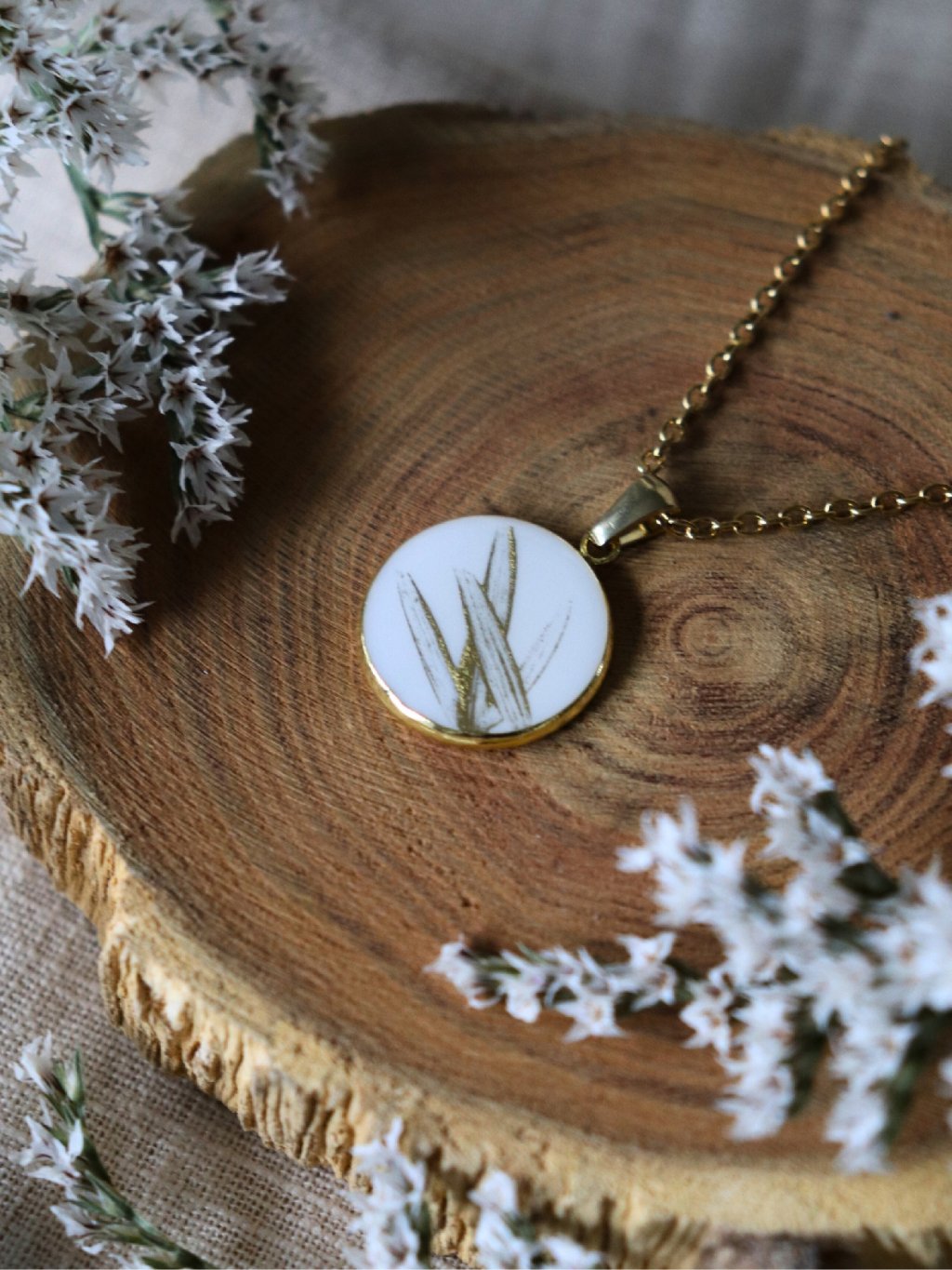 - Ručně vyráběný náhrdelník s elegantním bílým přívěskem zdobeným čárami a tahy štětce.