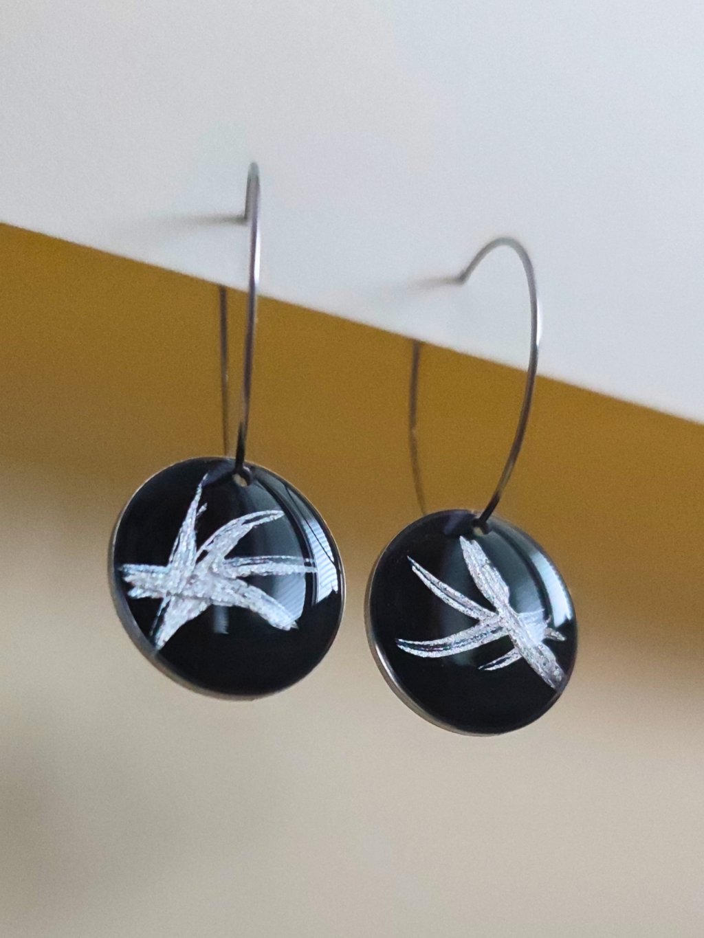 Minimalistické černé náušnice s abstraktním stříbrným motivem tahu štětce.