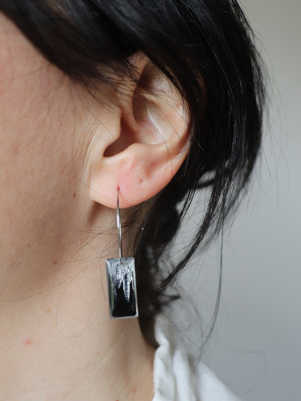 Hranaté delší náušnice v minimalistické černé a stříbrné kombinaci.