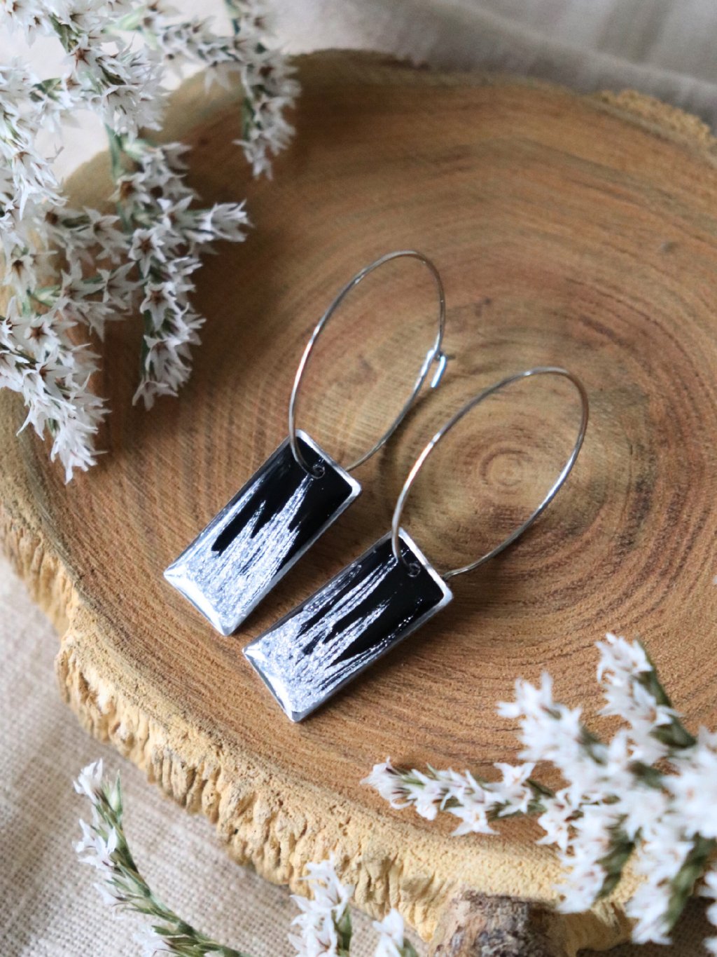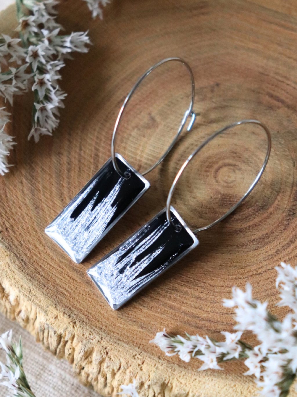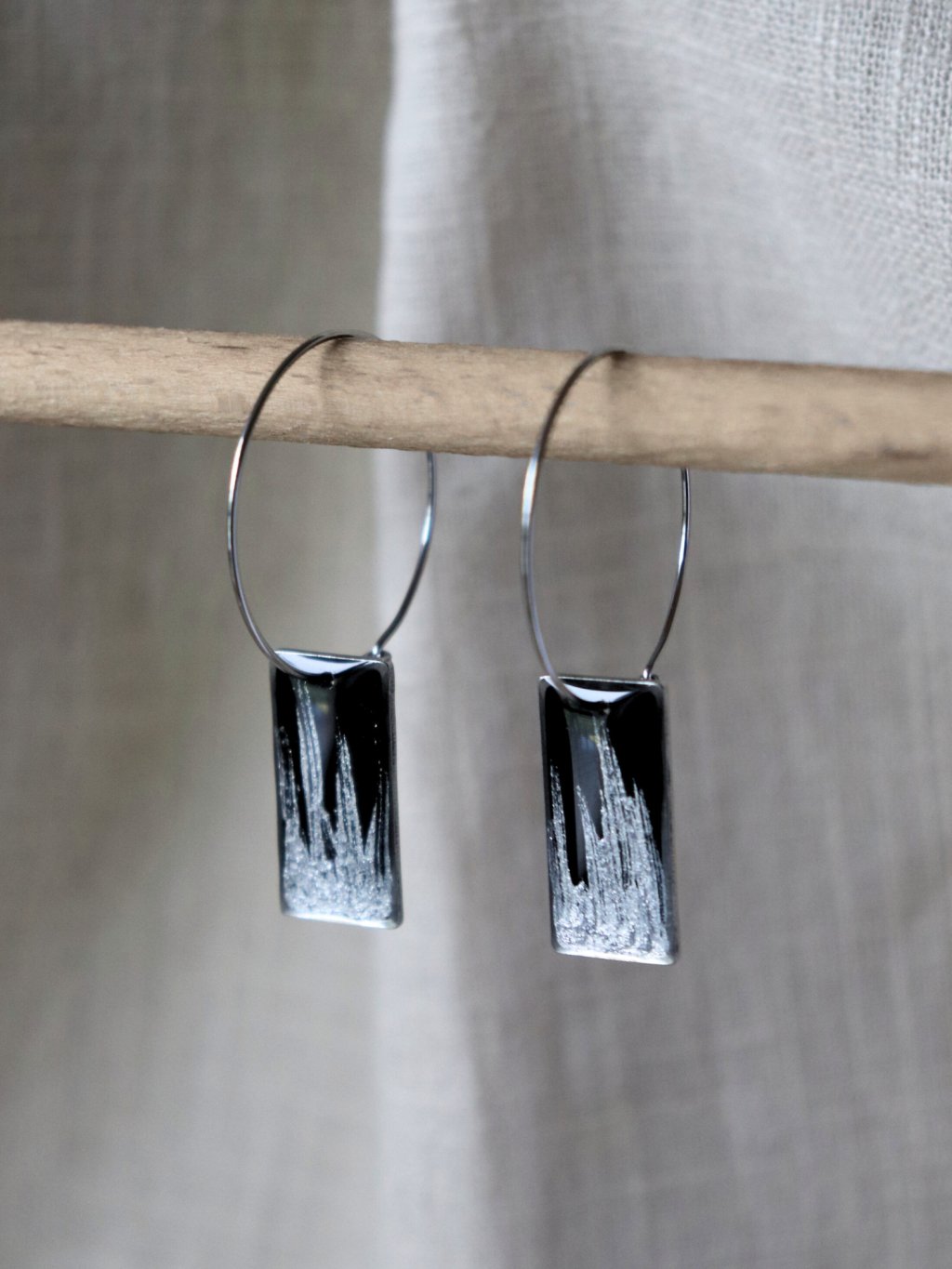 Velké visací náušnice obdélník - černá a stříbrná
