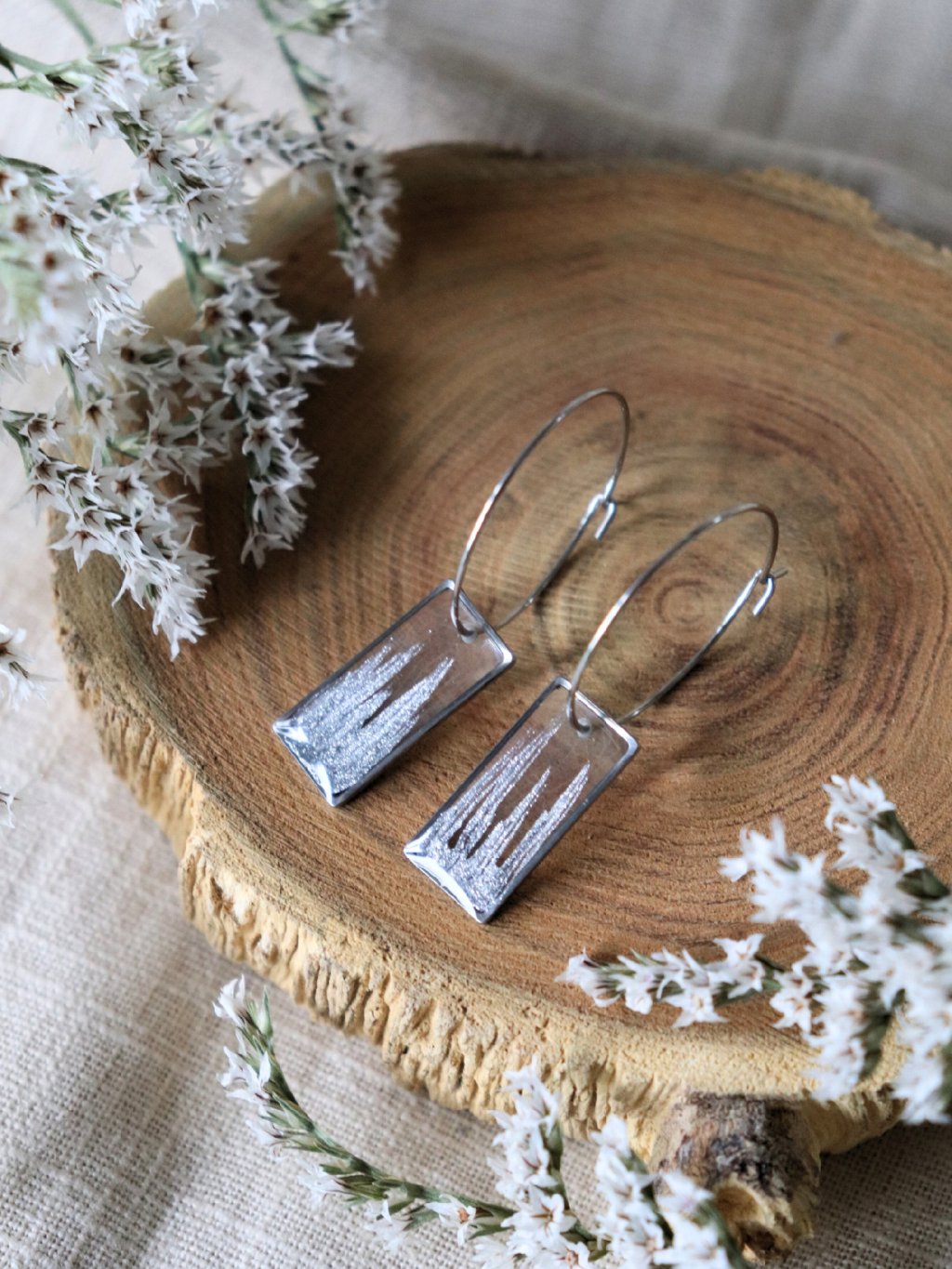 Moderní obdélníkové náušnice na velkém kroužku. Opticky prodlouží i kulatější obličeje :)