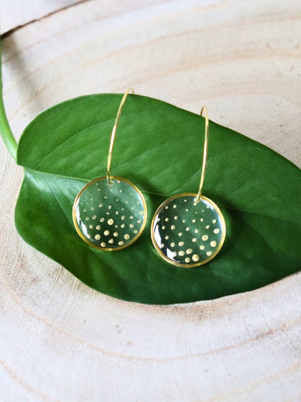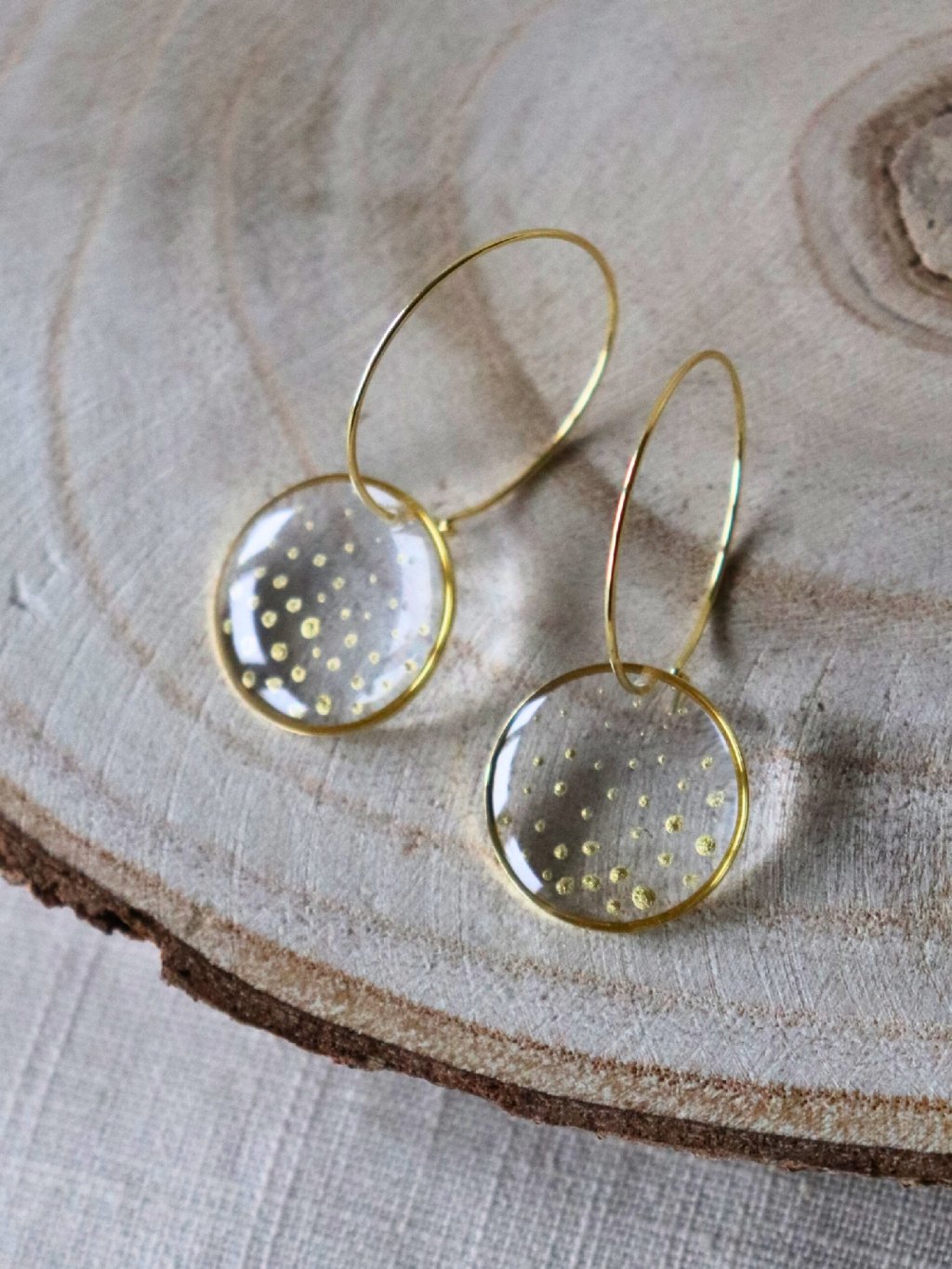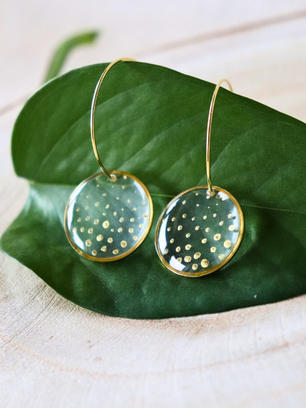 Efektní průhledné náušnice ve zlaté variantě, ručně malované. Hrají si s odlesky a světlem.