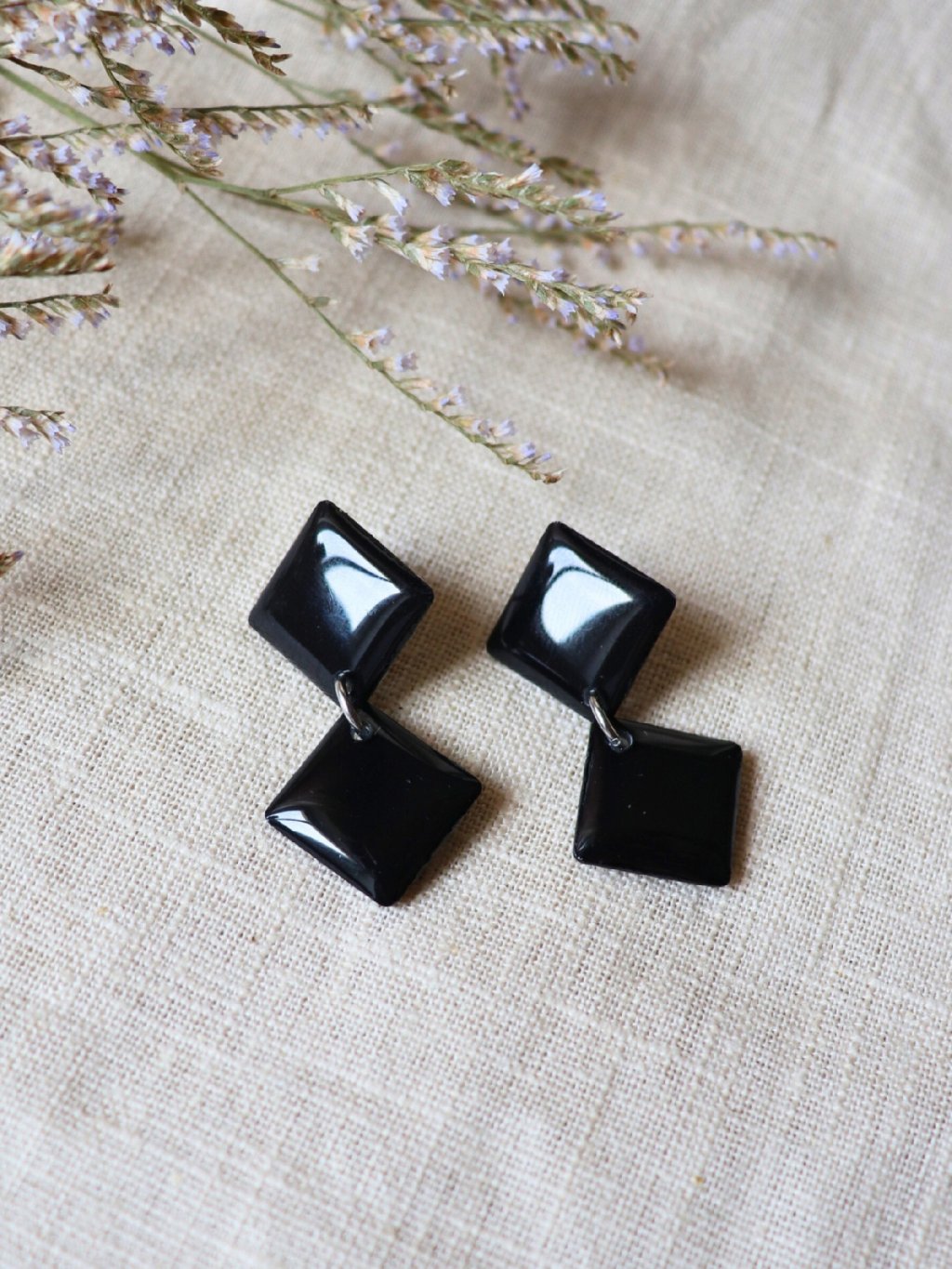 Visací černé čtvercové náušnice z pryskyřice a chirurgické oceli.