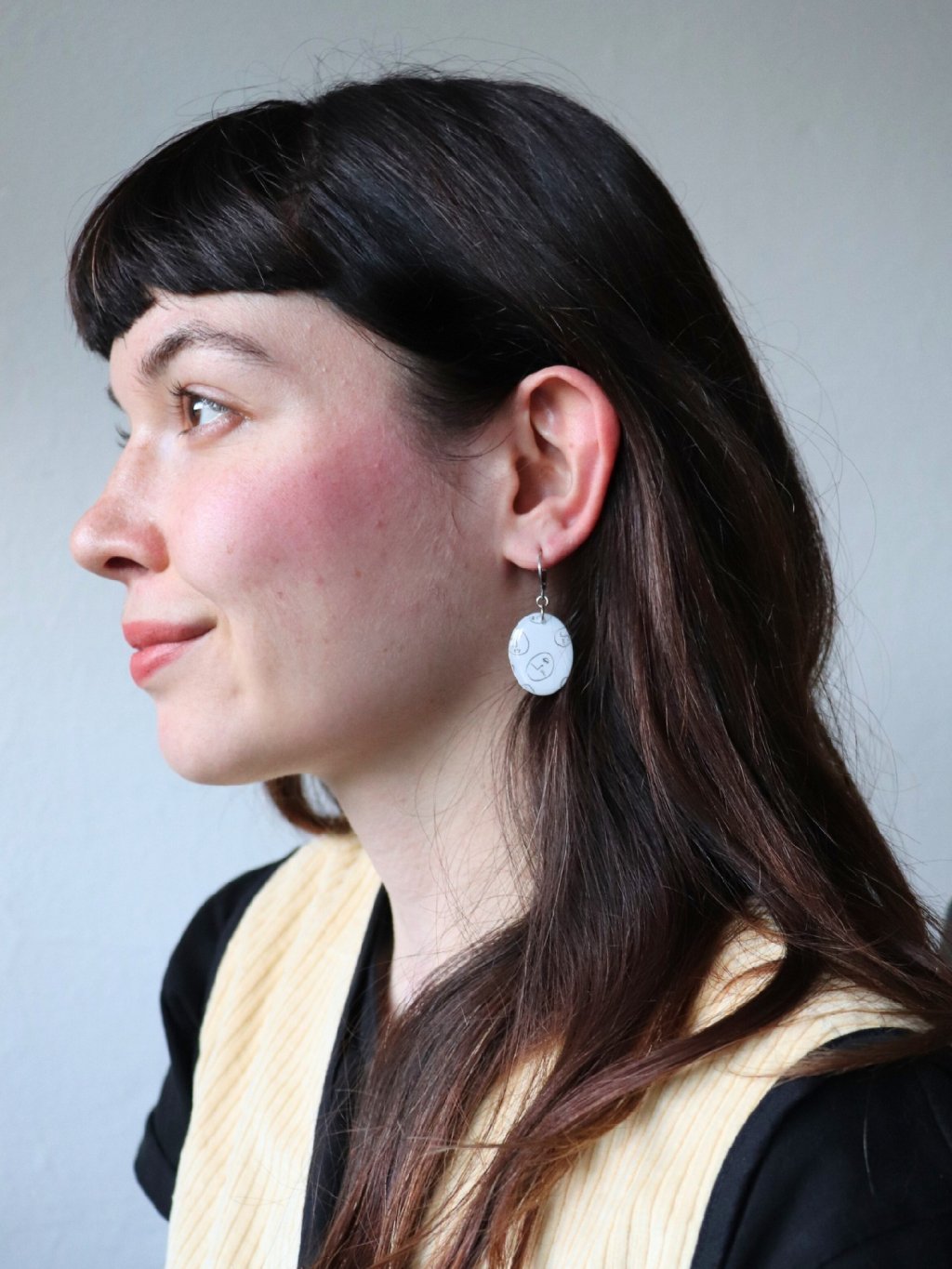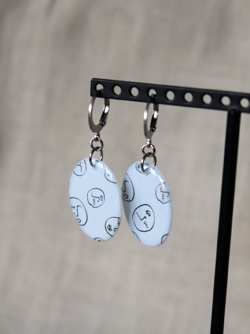 Jemné hravé náušnice ve tvaru oválu se vzorem stylizovaného obličeje. Kombinace bílého podkladu a černého motivu.