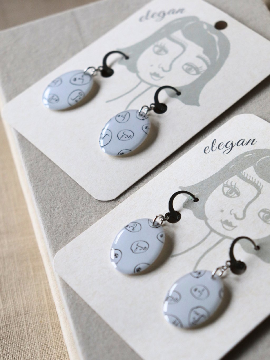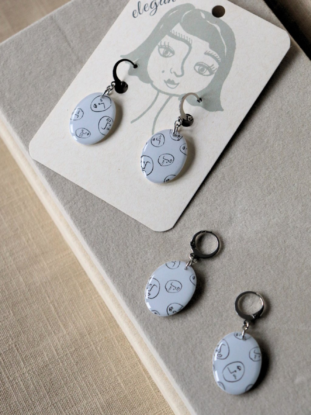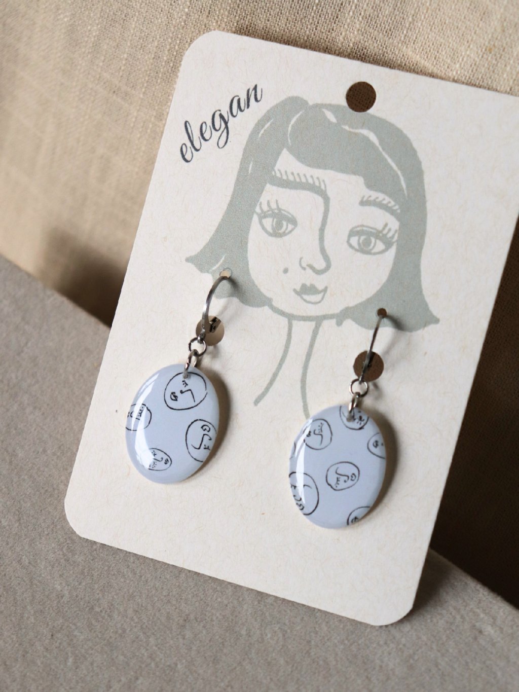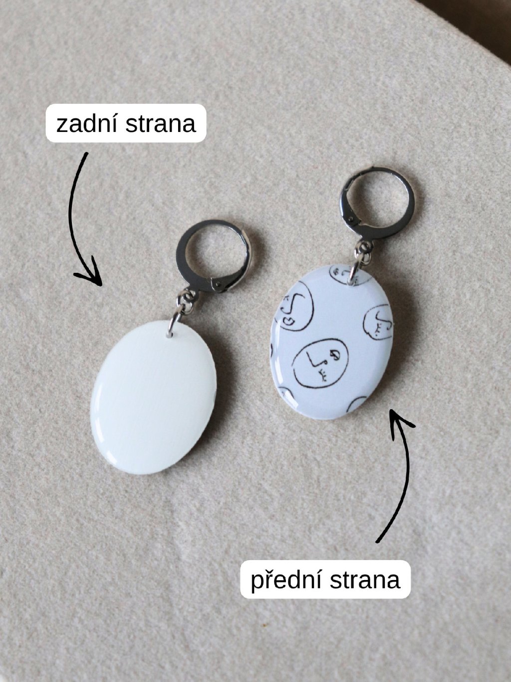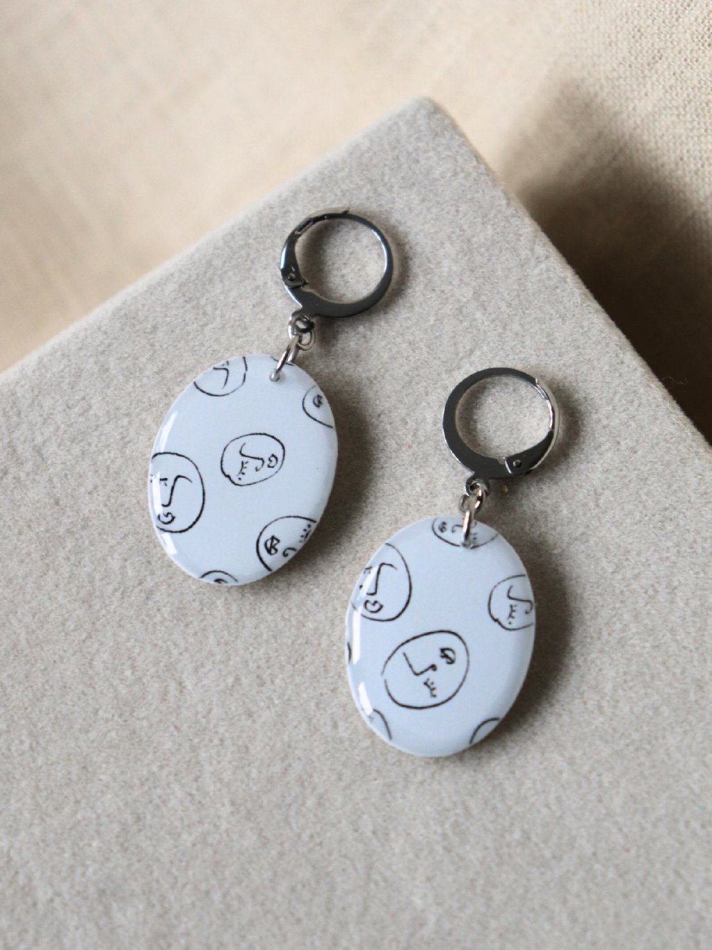 Jemné vzorované náušnice ve tvaru oválku. Jedná se o náš autorský motiv tvářiček z kolekce Obličeje - mrkněte na další výrobky s motivem! Náušnice visí na nerezovém stříbrném háčku a jsou vyrobeny z kvalitní pryskyřice.