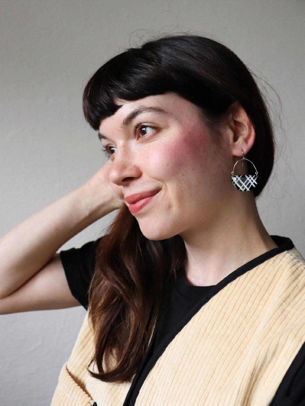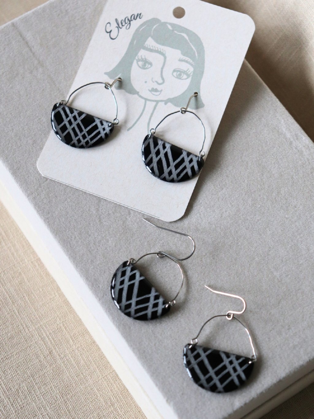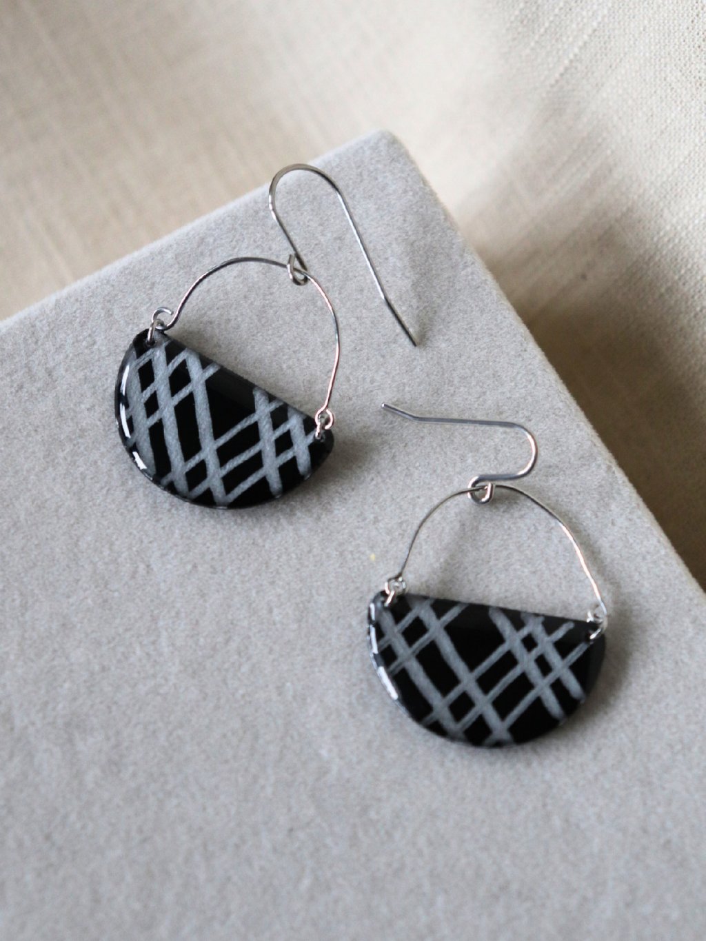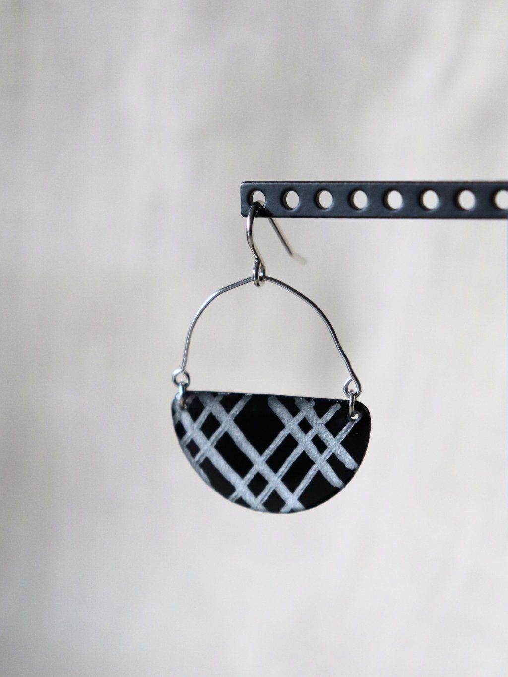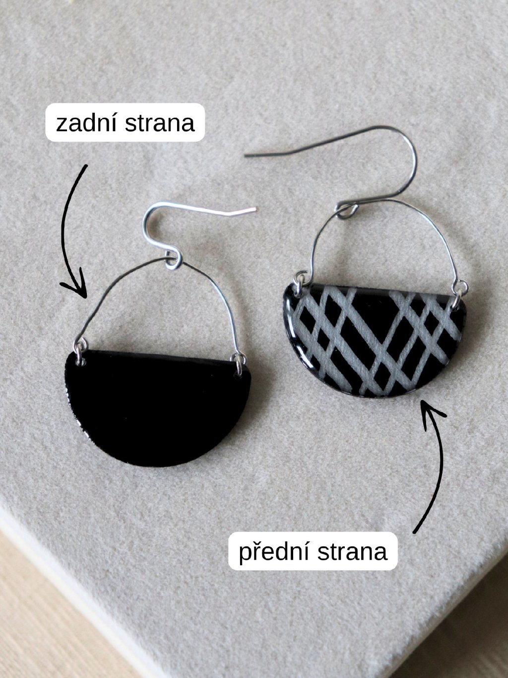 Ručně malované půlkruhové náušnice zavěšené na ocelovém drátku a afroháčku z oceli. Stříbrný motiv mřížky na černém podkladu.