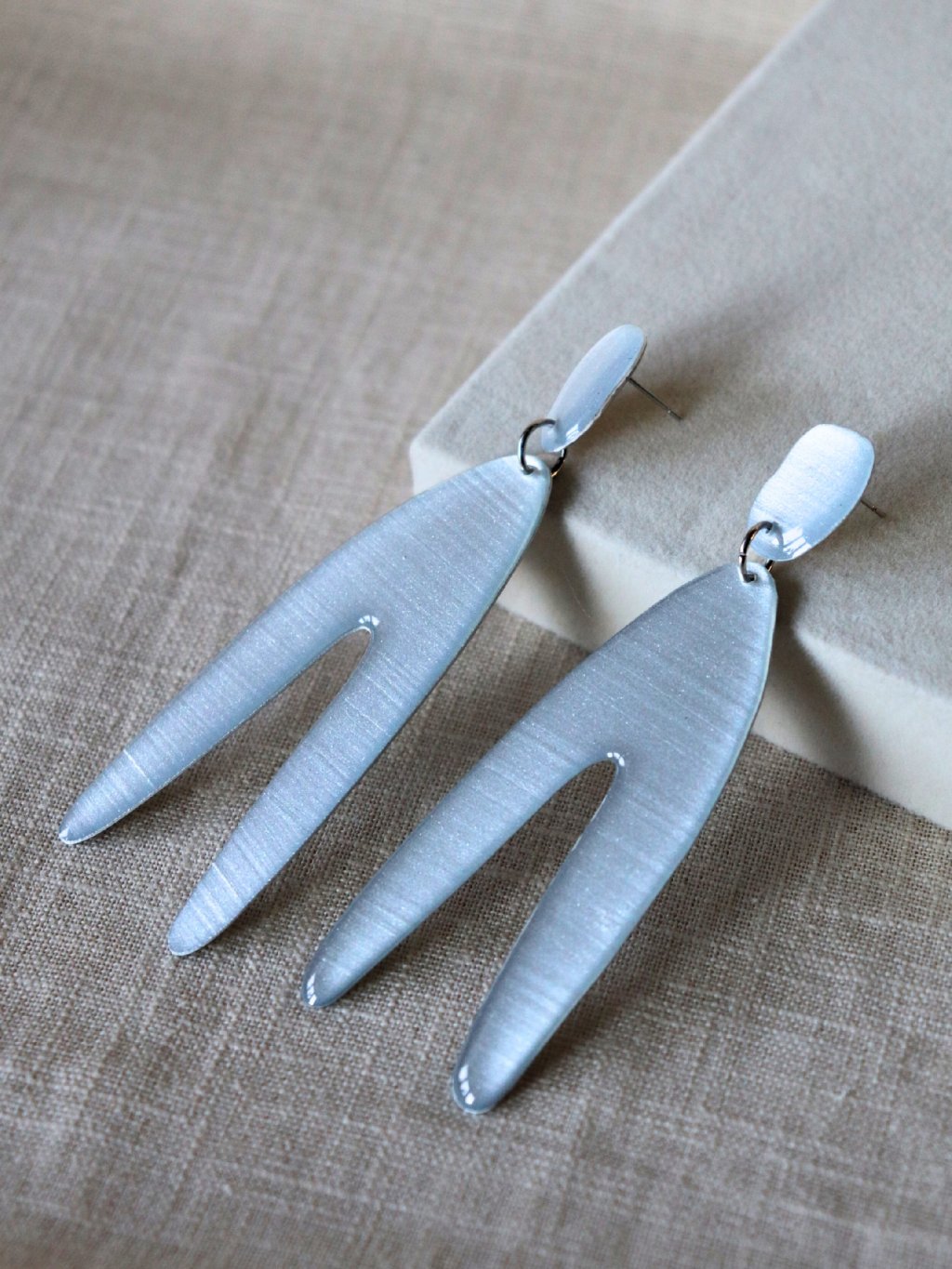 Výrazné visací náušnice ve tvaru jehlice nebo véčka.