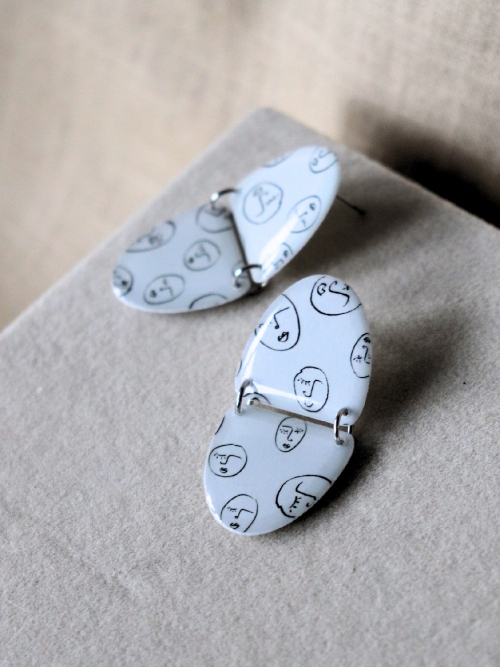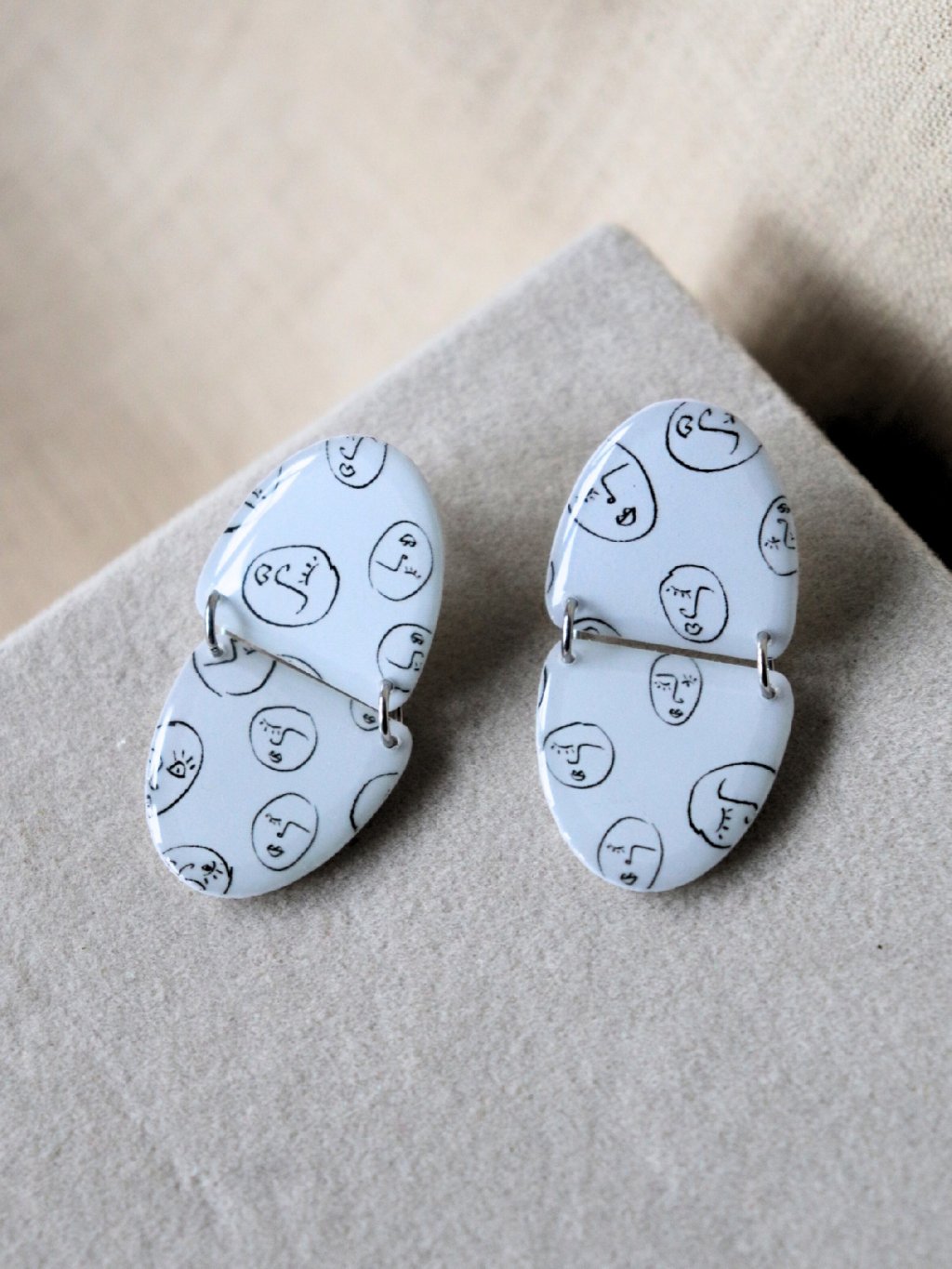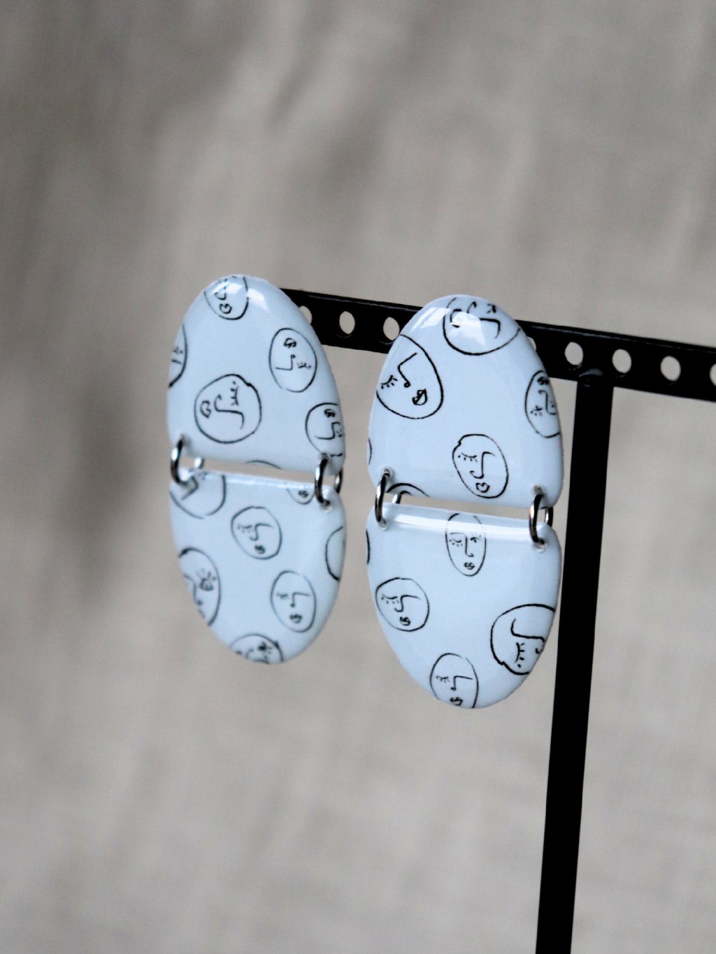 Designové bílé náušnice tvaru dvou půlkruhů, které jsou spojené nerezovými kroužky. Vzor obličejíků - naše autorská kolekce.
