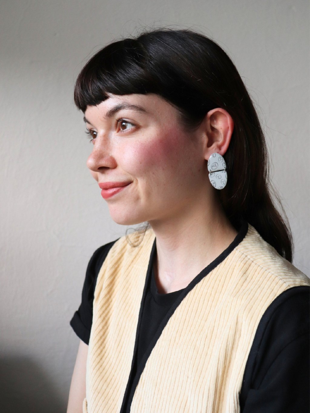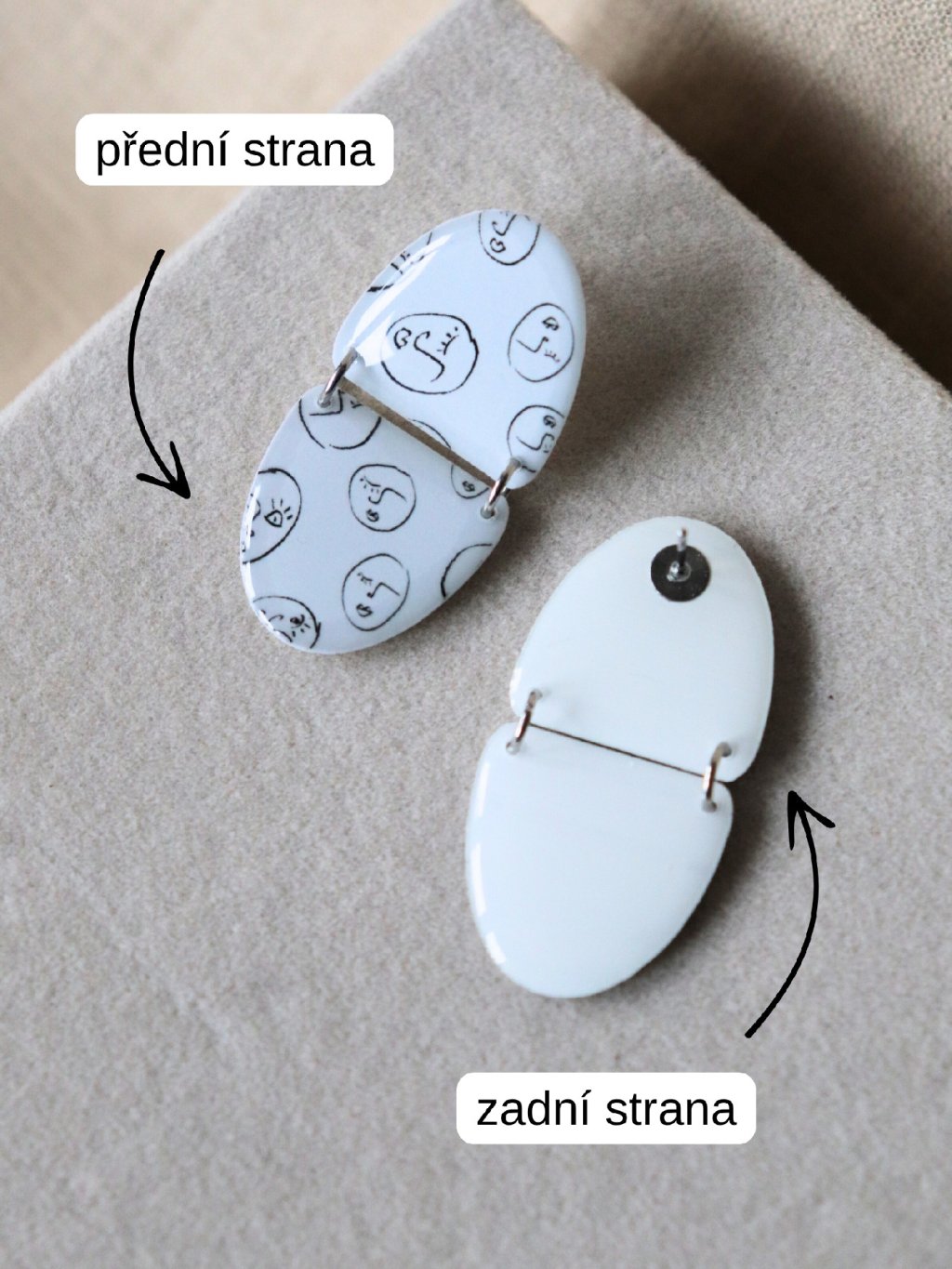 Zajímavé světlé napichovací náušnice se vzorem. Jedná se o náš autorský motiv tvářiček z kolekce Obličeje - mrkněte na další výrobky s motivem! Náušnice mají ze zadní strany připevněný dřík z chirurgické oceli a jsou vyrobeny z kvalitní pryskyřice.